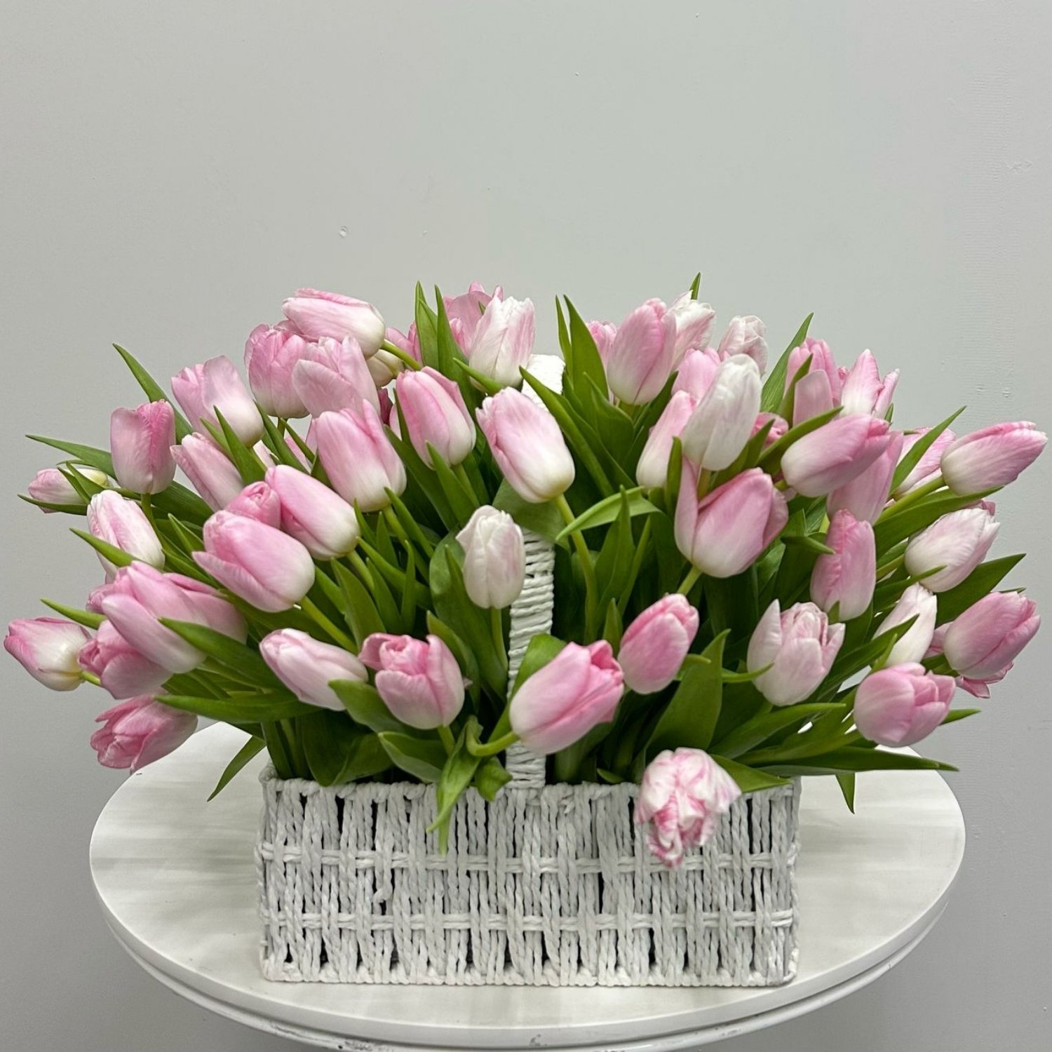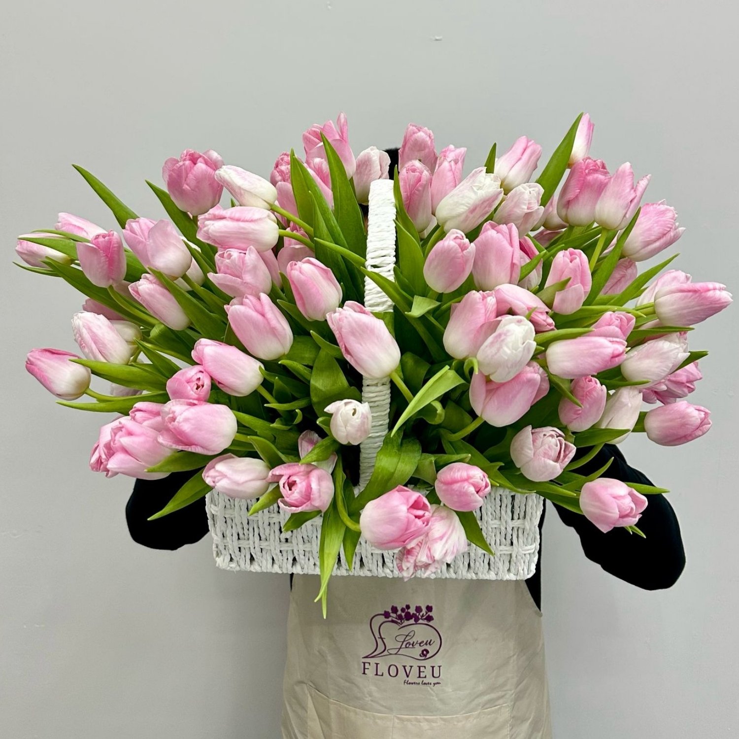 A breathtaking display of grace, love, and admiration, this basket of 25\49\101 premium pink tulips radiates elegance and charm. The soft pink hues symbolize affection and happiness, making this arrangement perfect for anniversaries, birthdays, baby showers, or any heartfelt occasion. Beautifully arranged in a stylish basket, these tulips create a stunning floral masterpiece that brings warmth and joy to every moment.