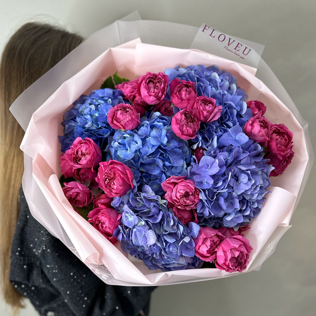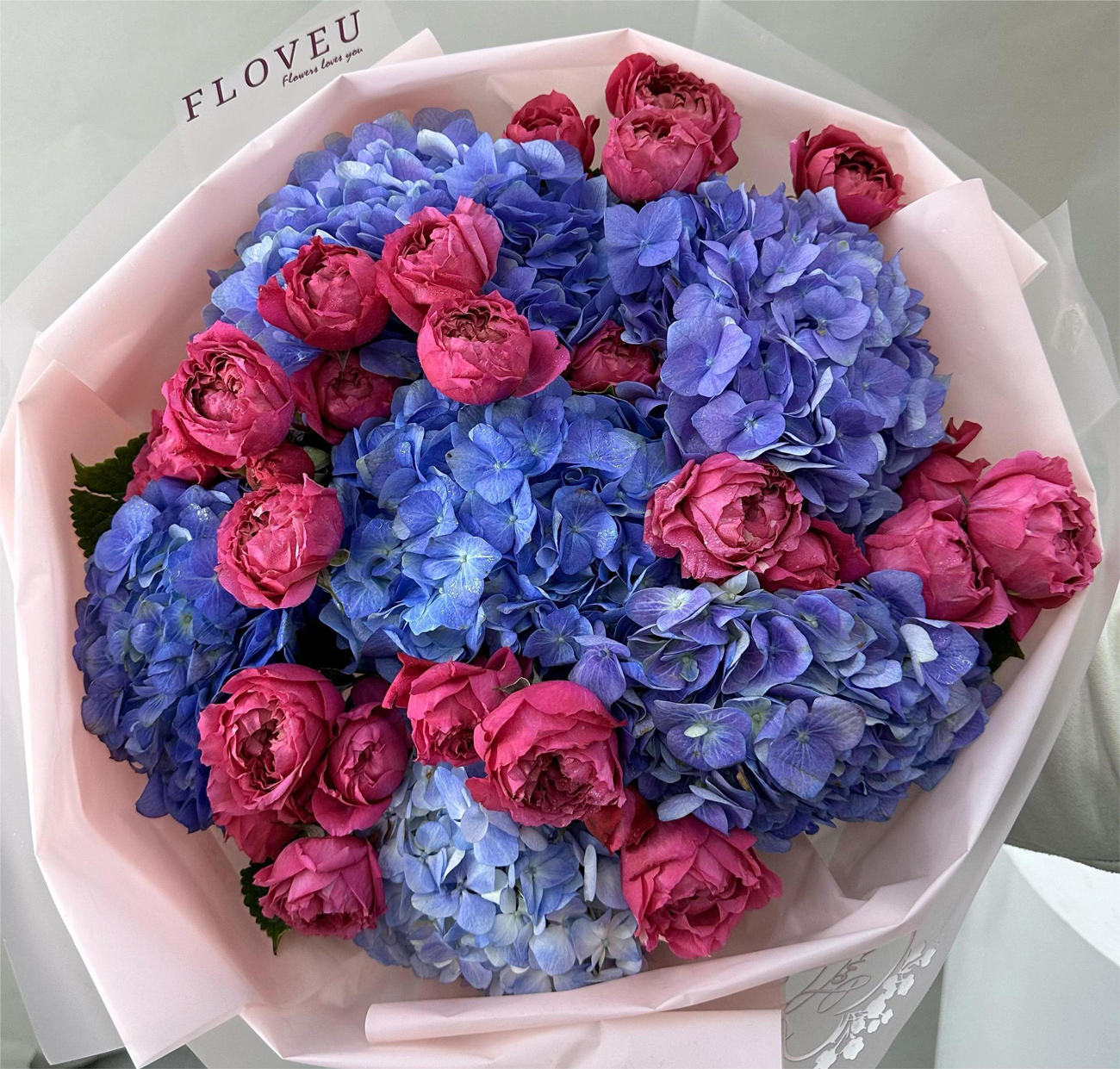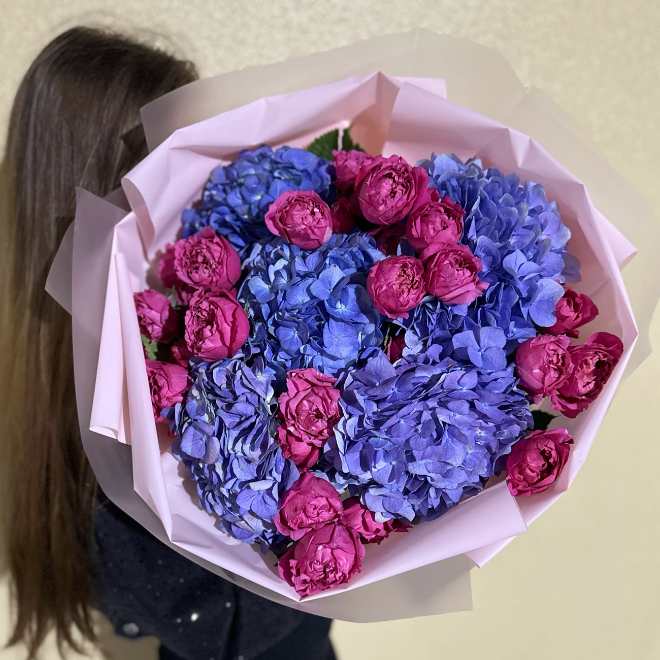 A stunning arrangement of pink Bombastic flowers and vibrant blue hydrangeas, beautifully wrapped in baby pink paper, blending softness with a pop of bold color.