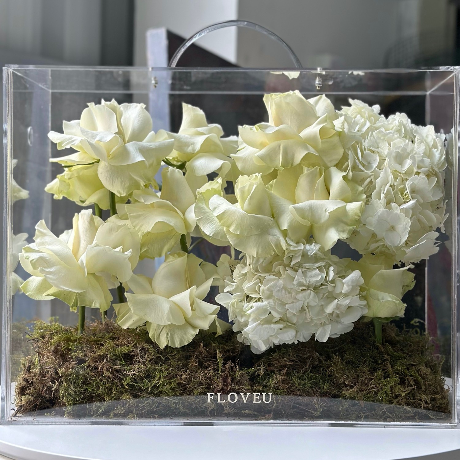 The BloomBox White in an acrylic bag is the perfect fusion of elegance and modern sophistication. Featuring a curated selection of pristine white blooms, this bouquet is beautifully housed in a sleek, transparent acrylic bag that enhances its fresh, minimalist appeal. The clear, contemporary packaging lets the delicate petals shine, creating a visually stunning presentation that brings a touch of luxury and refinement. Ideal for any occasion, the **BloomBox White** exudes timeless beauty, adding a graceful, serene vibe wherever itโs displayed.
