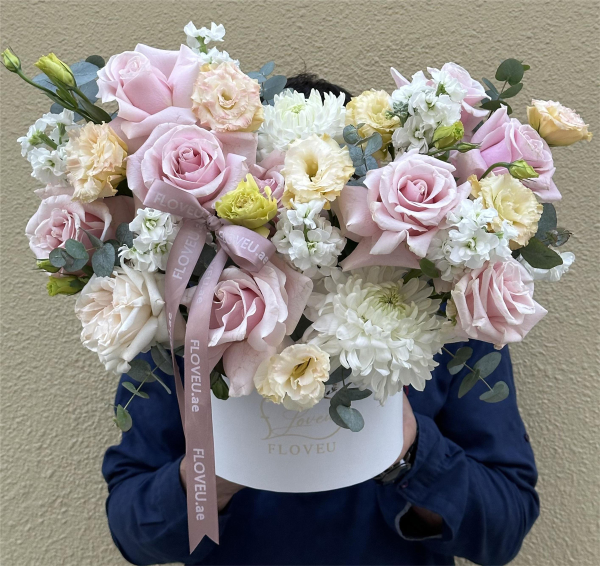 A charming white paper box filled with a delightful mix of pink roses, vibrant chrysanthemums, delicate delphiniums, and cheerful yellow mini roses, creating a vibrant and joyful arrangement.