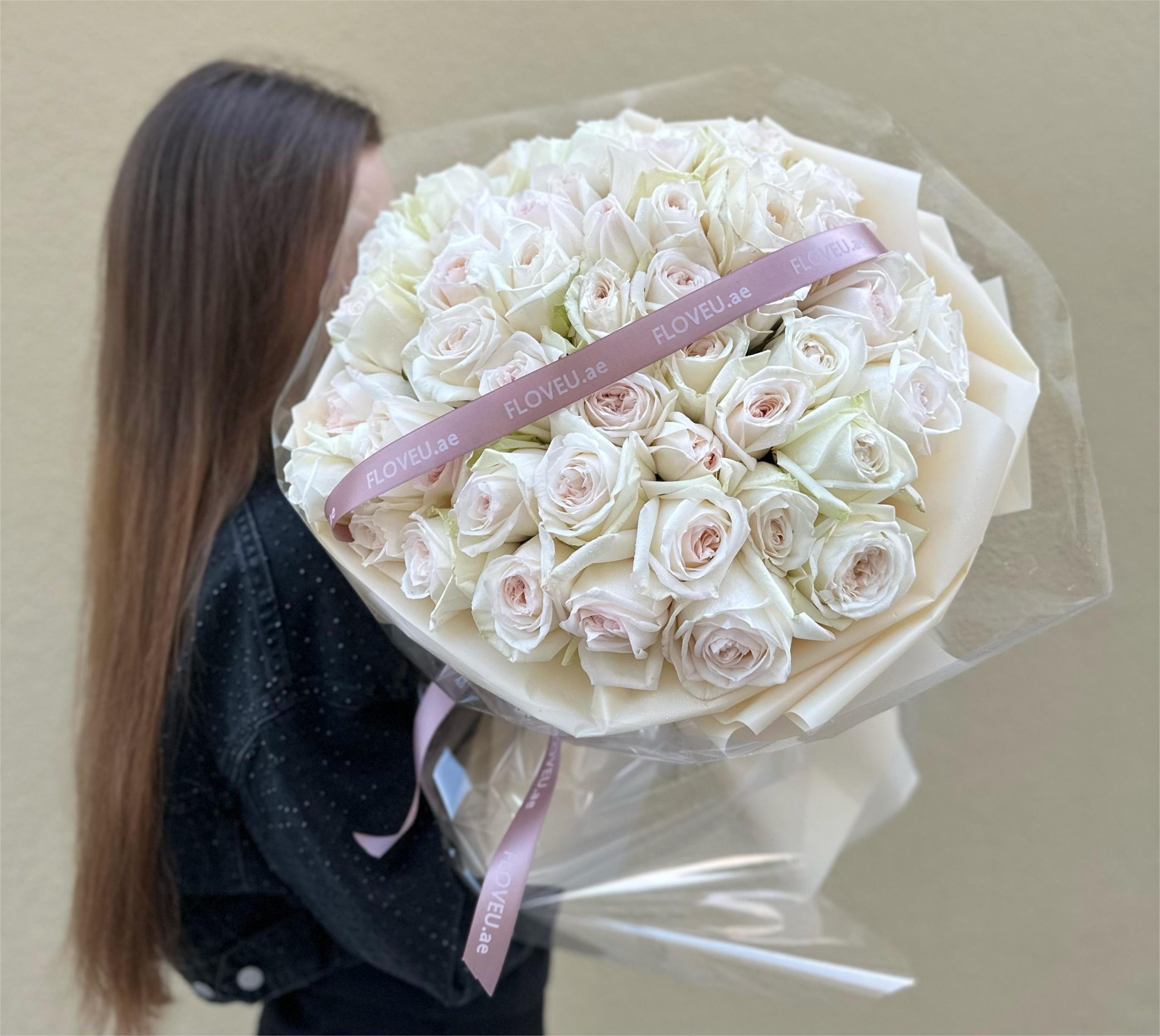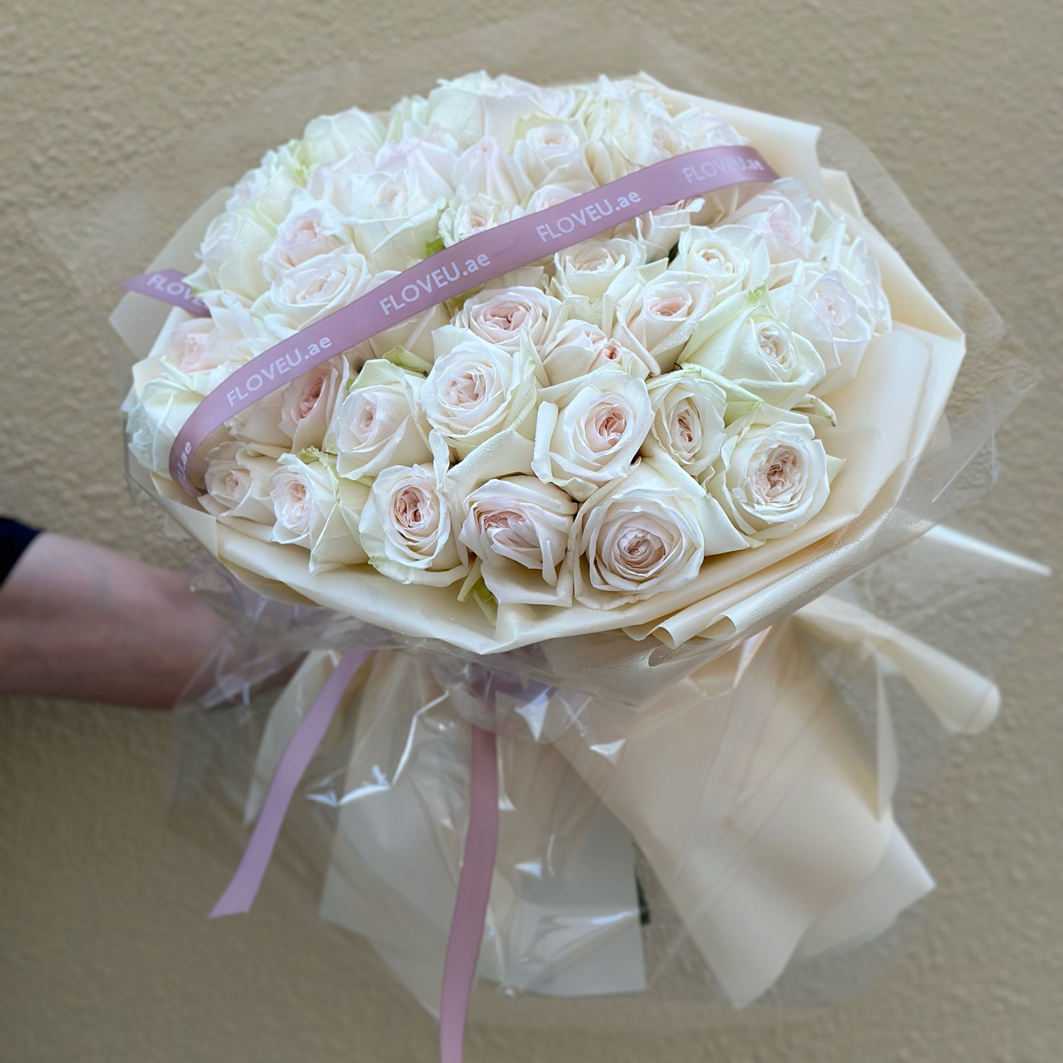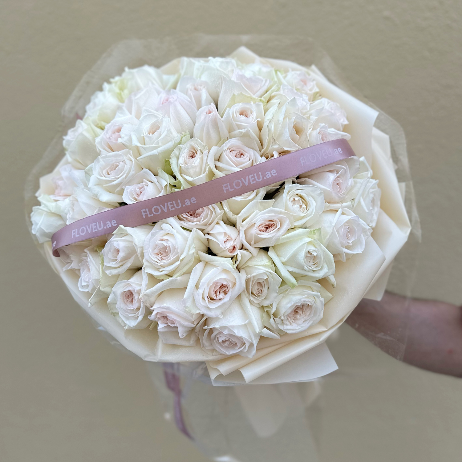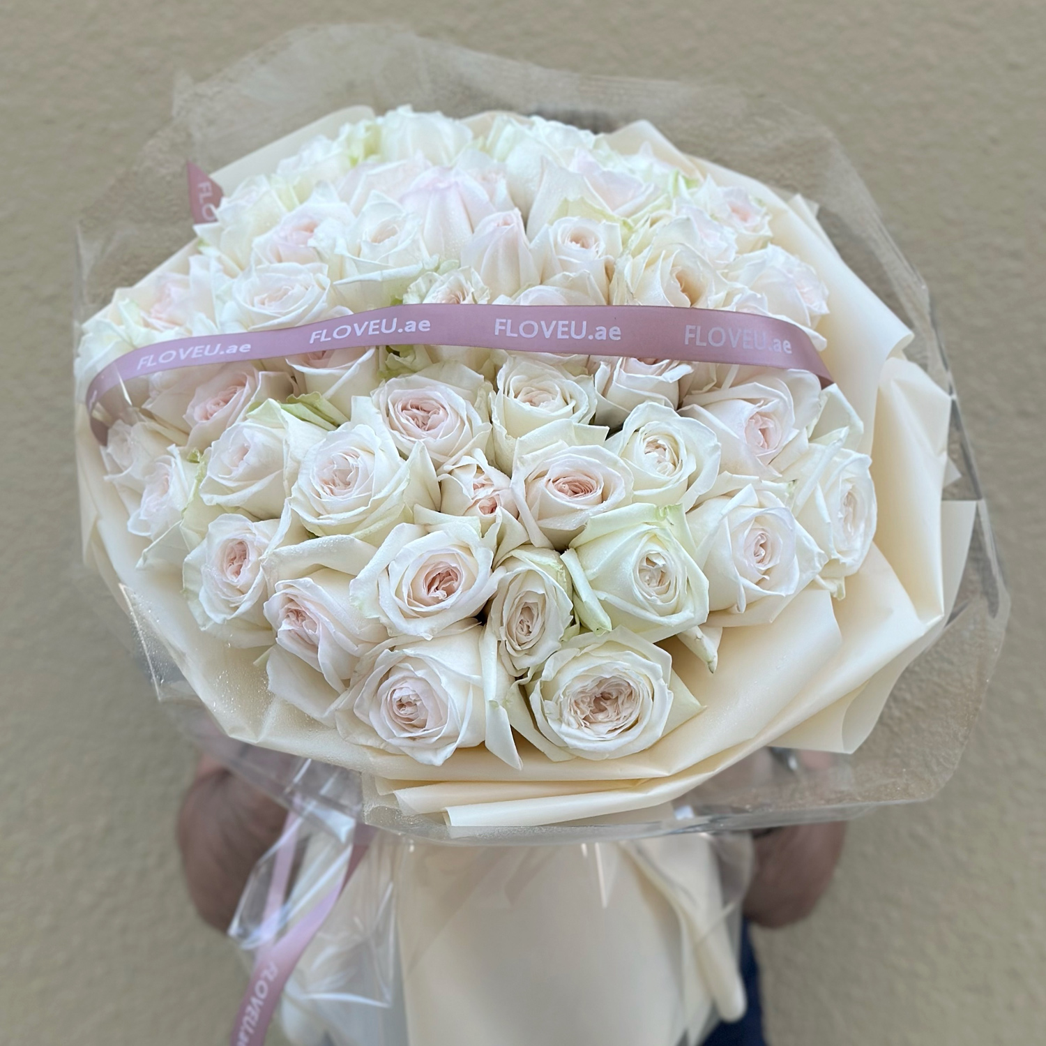 Elegant pinkish-white roses presented in transparent wrapping, showcasing their natural beauty with a touch of delicate charm.