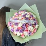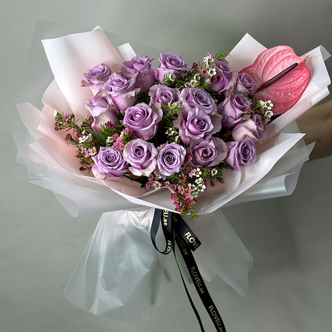 A charming arrangement of purple roses, delicate wax flowers, and elegant anthuriums, wrapped in soft baby pink paper, creating a romantic and sophisticated display.