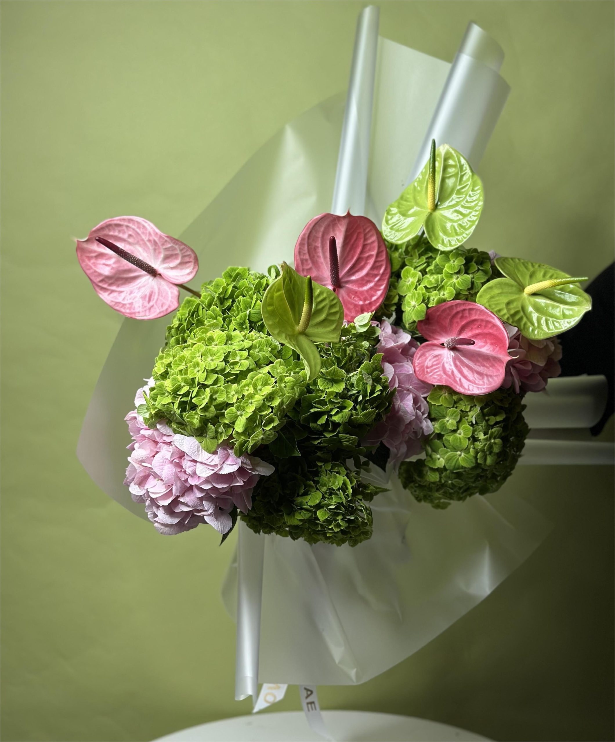 A crystal colour wrapping papper bouqet having green and pink hydrangeas and pink and green anthurims.