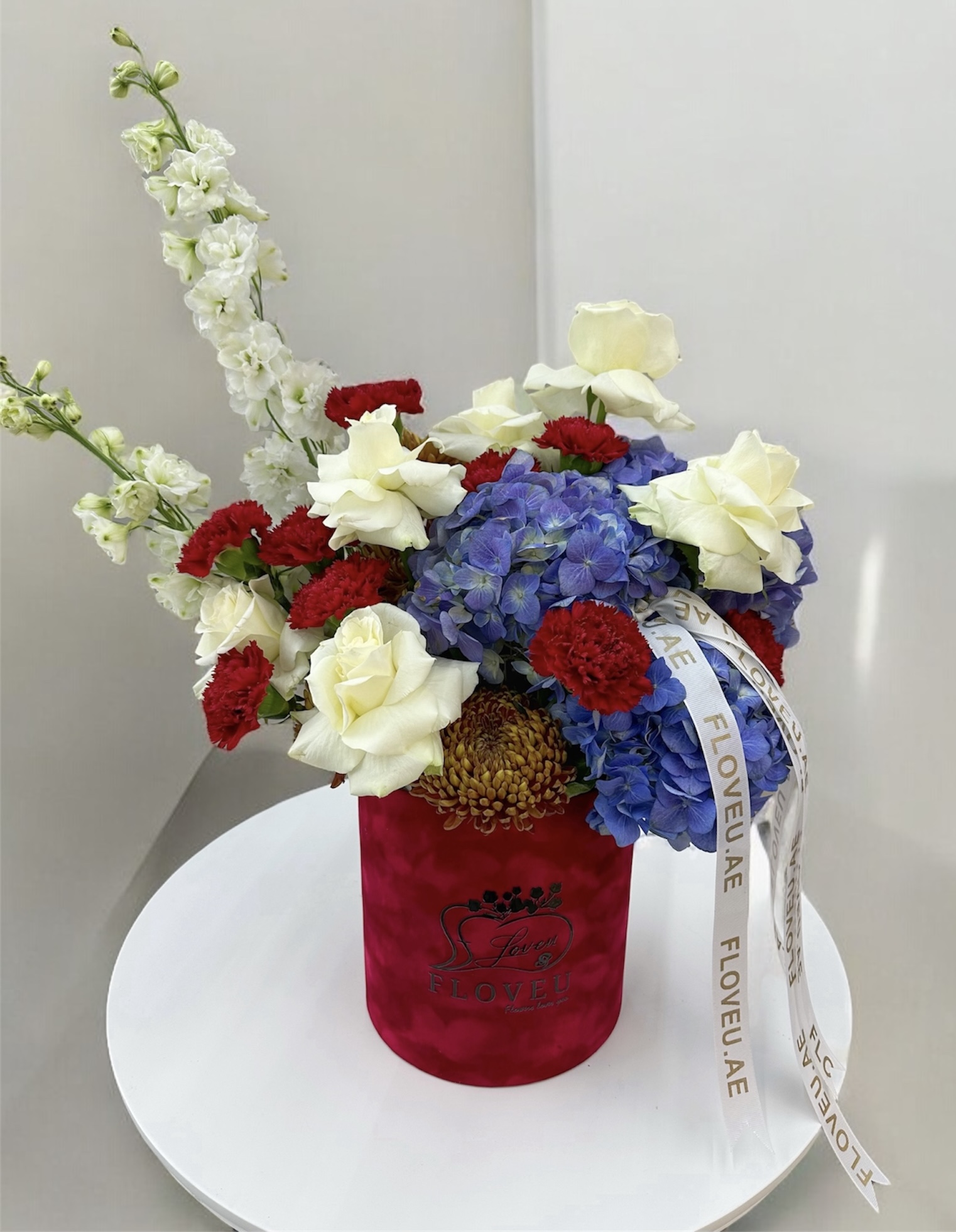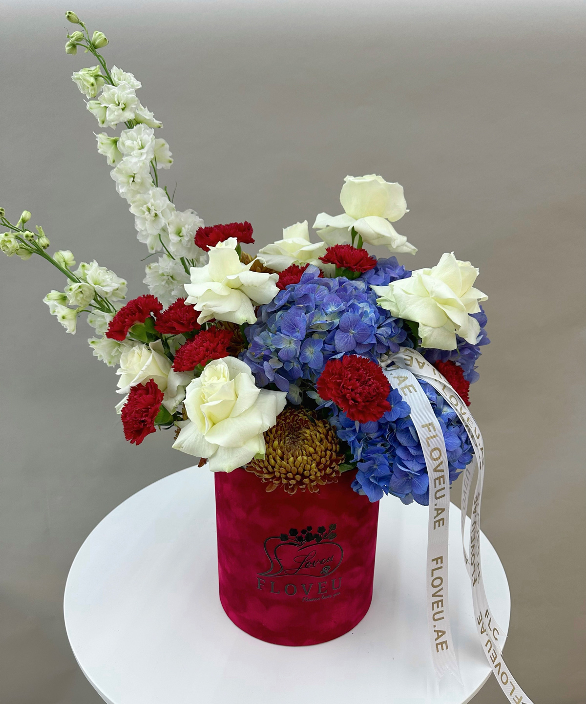 Floral Fiesta is a vibrant and lively bouquet that bursts with color and energy, bringing together a stunning array of blooms. The cool, serene blue hydrangeas create a soft yet bold foundation, while the violet roses add an elegant touch of romance. White roses bring purity and grace to the mix, contrasting beautifully with the deep red flowers that inject passion and vibrancy into the arrangement. The soft, violet-hued eucalyptus adds a refreshing natural element, and the Alpadinum introduces a unique flair that elevates the overall composition. Perfect for celebrating any special occasion or simply adding a joyful touch to your day, Floral Fiesta is a celebration of natureโs most radiant colors, creating a dynamic and unforgettable display of beauty and elegance.