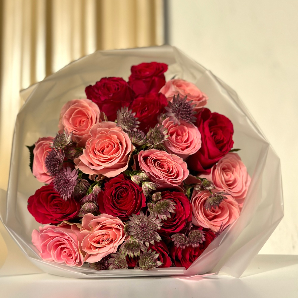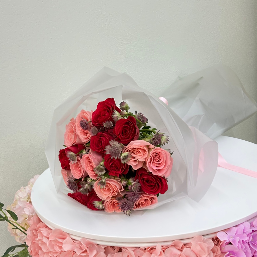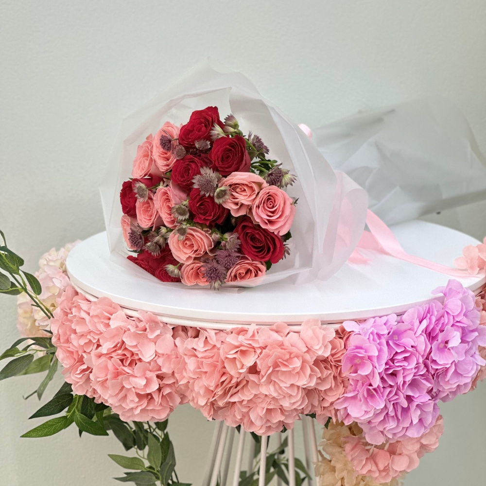 The Romantic Reverie bouquet combines the timeless beauty of red, pink, and classic roses with the delicate elegance of Astilbe. This stunning arrangement exudes love and sophistication, making it the perfect choice for any special occasion. Whether as a gift or a centerpiece, it adds a touch of elegance and charm to any setting.