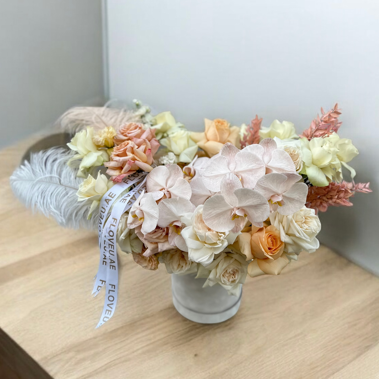 A graceful grey velvet box adorned with vibrant purple phalaenopsis, soft peach roses, lush hydrangeas, and delicate off-white roses, evoking the serene beauty of a moonlit evening.