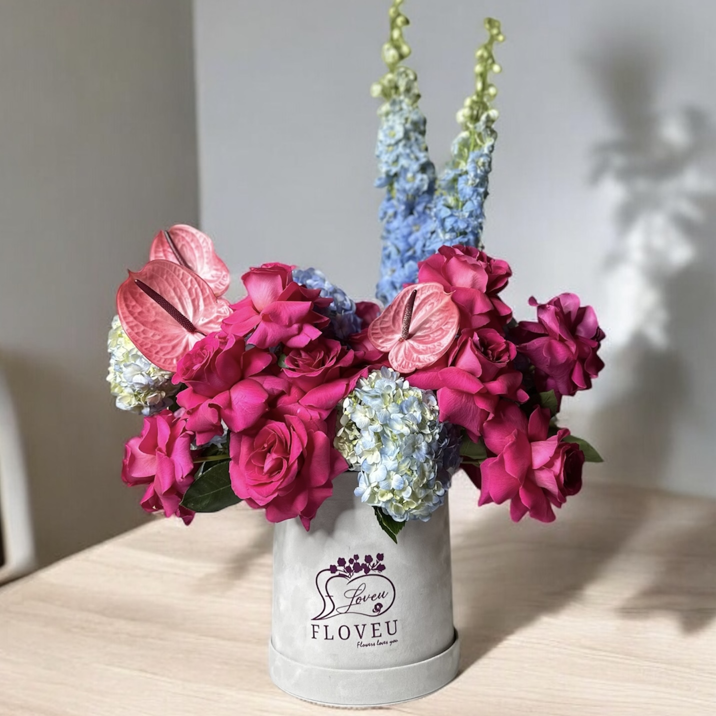 A striking grey velvet box featuring a captivating blend of deep anthurium, vibrant purple delphinium, elegant purple hydrangeas, and rich dark pink roses, creating a mystical and sophisticated arrangement.