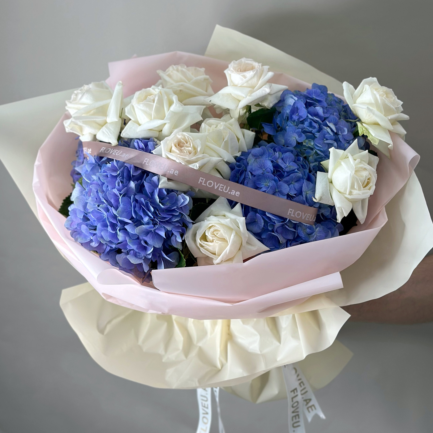 A serene arrangement of blue hydrangeas and off-white roses, elegantly wrapped in soft off-white and pink paper, evoking the tranquility and beauty of ocean waves.