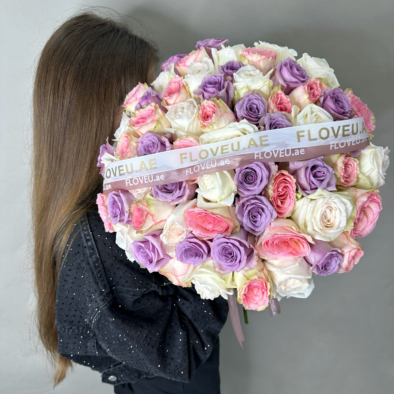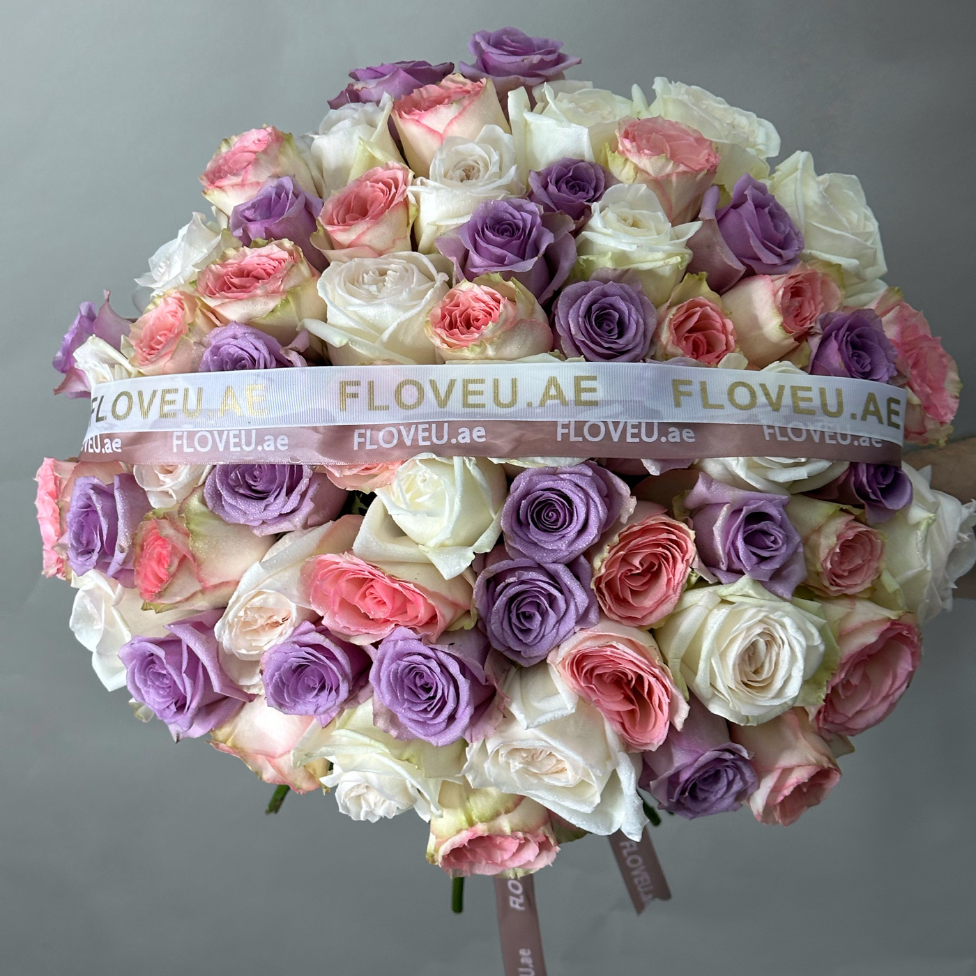 A graceful arrangement showcasing a blend of purple, pink, and off-white roses, elegantly presented without wrapping for a natural and timeless display.