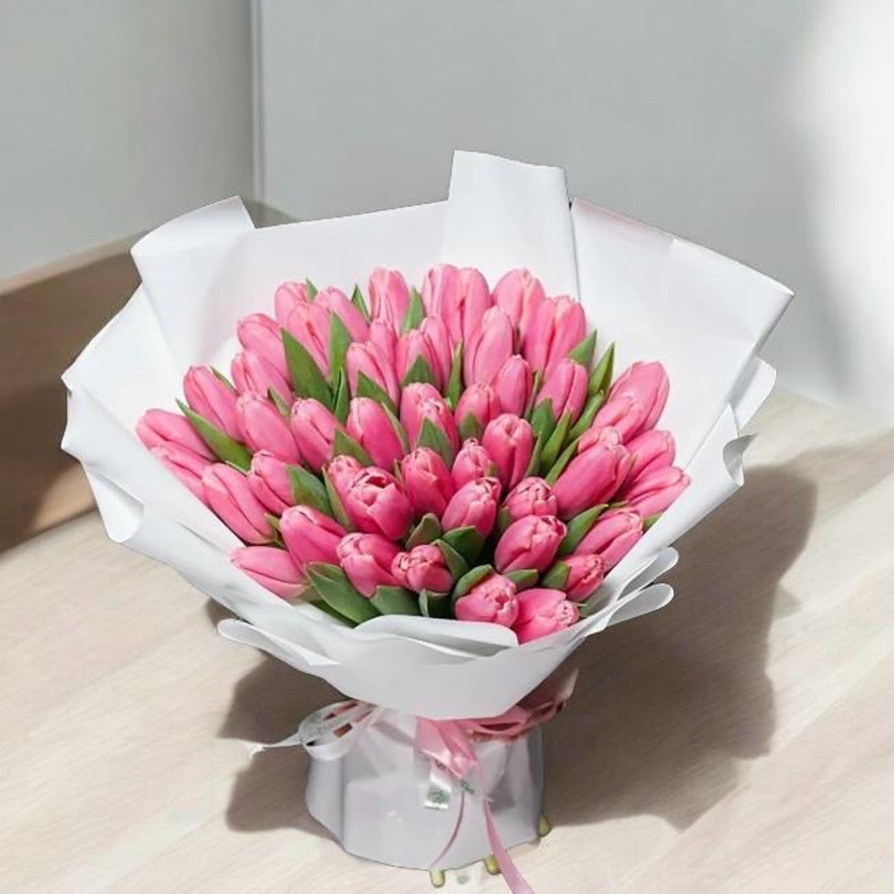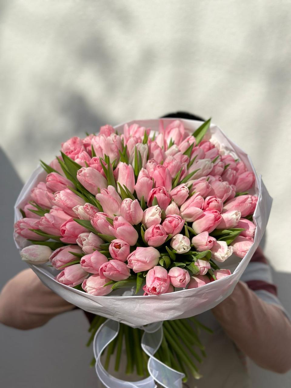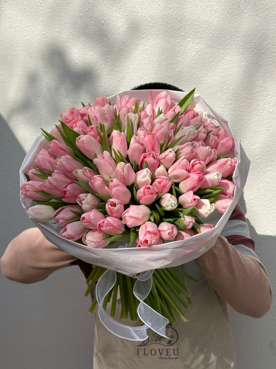 A stunning bouquet of 50 premium pink tulips, symbolizing grace, admiration, and affection. Their soft pink hues exude elegance and charm, making them a perfect gift for birthdays, anniversaries, baby showers, or any special occasion. This delicate yet vibrant floral arrangement is a timeless way to express love and appreciation, bringing beauty and joy to every moment.