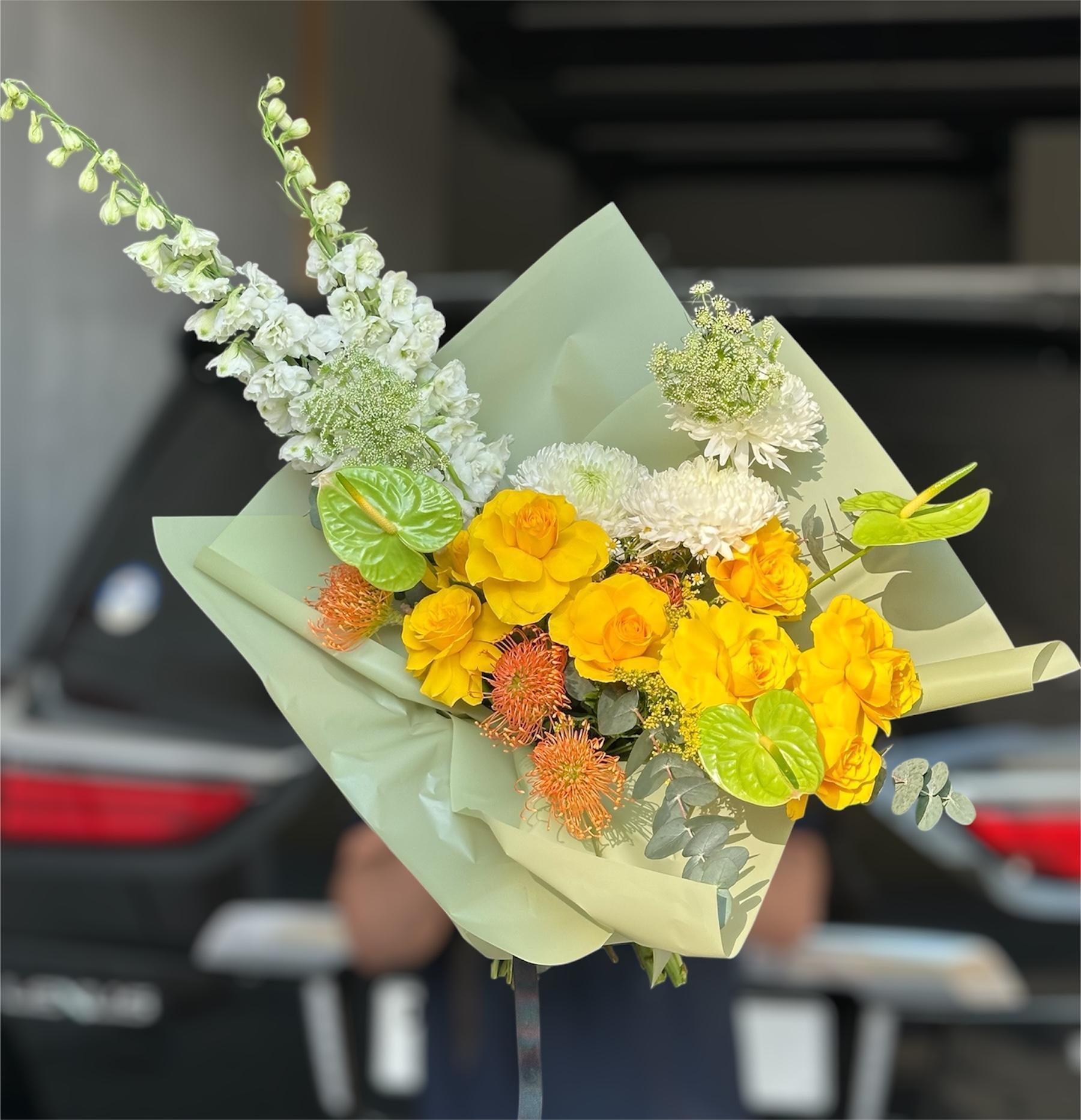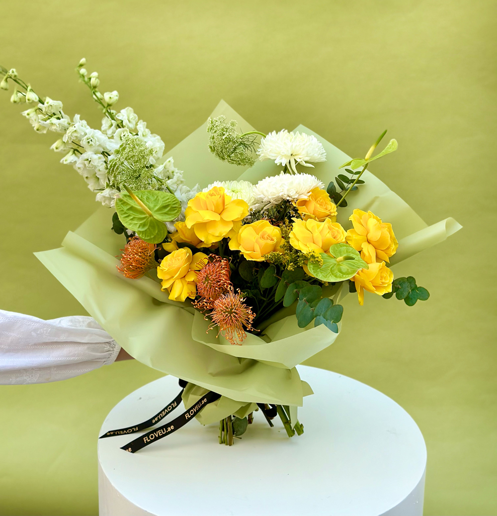 A striking arrangement of white delphiniums, charming yellow roses, crisp white anthuriums, leucospermum cordifolium, and vibrant green anthuriums, creating a bold yet harmonious display of color and sophistication.
