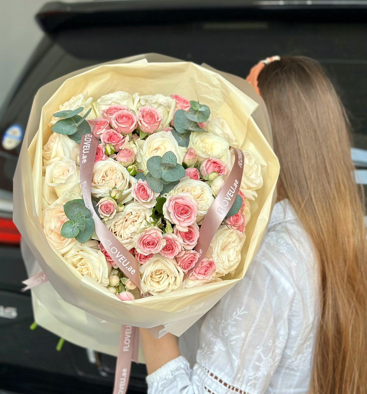 A beautifully round bouquet featuring a blend of vibrant yellow and soft baby pink roses, creating a cheerful and romantic display.
