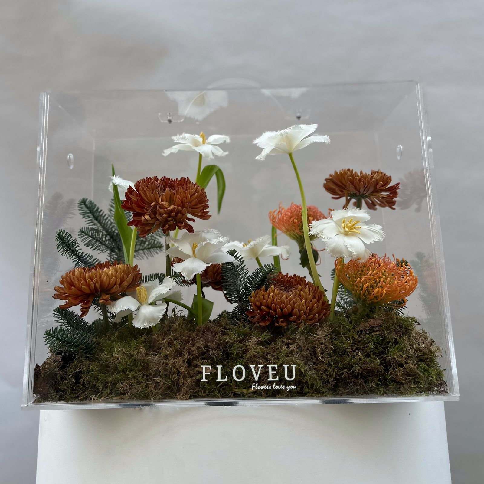 Step into the heart of nature with this enchanting arrangement. Set in a transparent acrylic briefcase, it features pristine white tulips, striking cordifolium, and a lush grassy surface, evoking the serene beauty of a woodland retreat.
